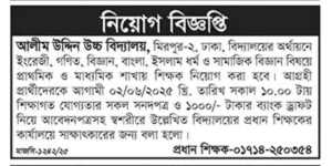 দেশের অন্যতম প্রতিষ্ঠিত শিক্ষা প্রতিষ্ঠান আলীম উদ্দিন উচ্চ বিদ্যালয়, ঢাকা-তে নতুন করে শিক্ষক নিয়োগ দেওয়া হচ্ছে। বিদ্যালয়ের নিজস্ব অর্থায়নে প্রাথমিক ও মাধ্যমিক শাখায় বিভিন্ন বিষয়ের জন্য যোগ্য প্রার্থীদেরকে সাক্ষাৎকারের মাধ্যমে নিয়োগ দেওয়া হবে। আগ্রহী প্রার্থীদের জন্য এটি একটি দারুণ সুযোগ।